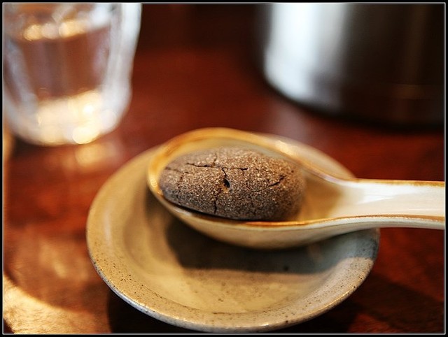 放在湯匙上端到客人面前