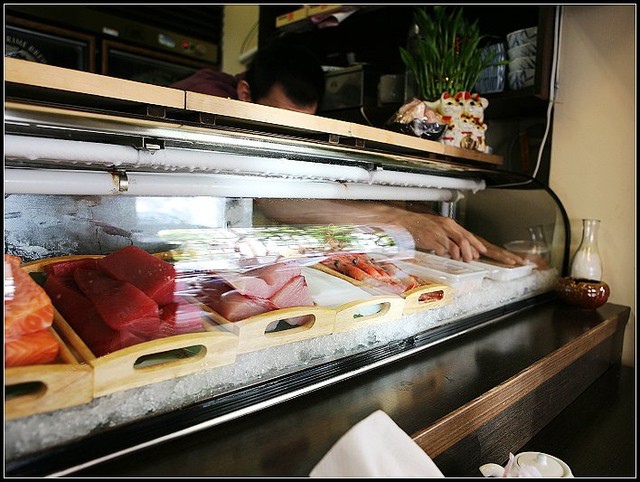 我就坐在板前看著店內整理魚貨