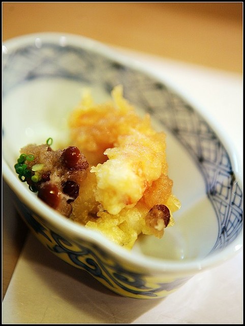 新鮮的明蝦跟魚片炸成天婦羅後