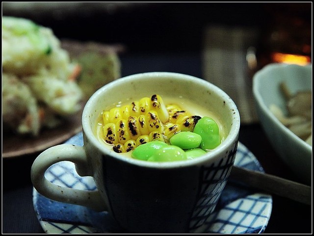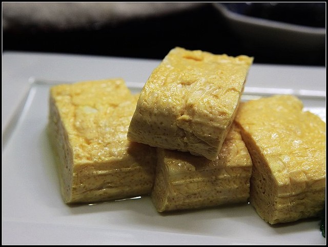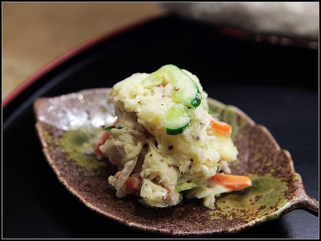 盤中有三品冷菜分別是蒸蛋、馬鈴薯沙拉以及高野豆腐