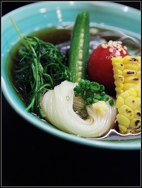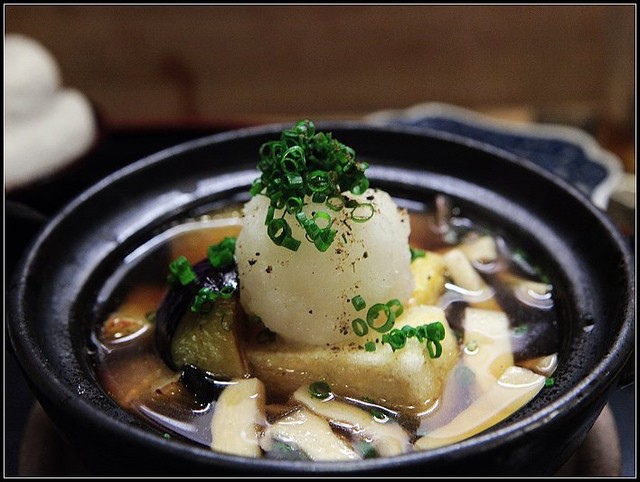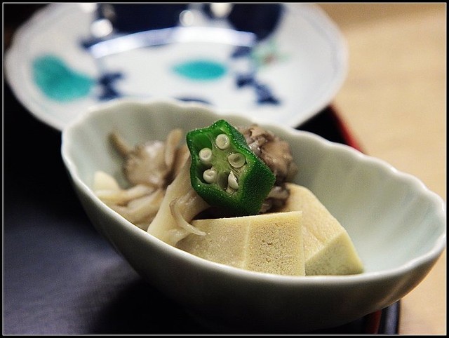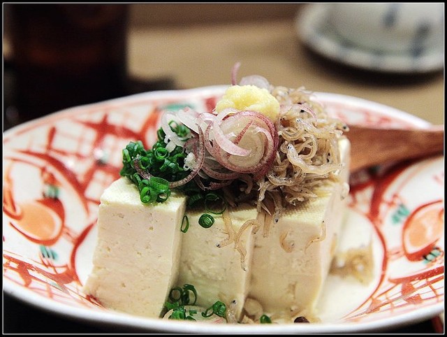 木棉豆腐綴著吻仔魚、茗荷、蔥薑